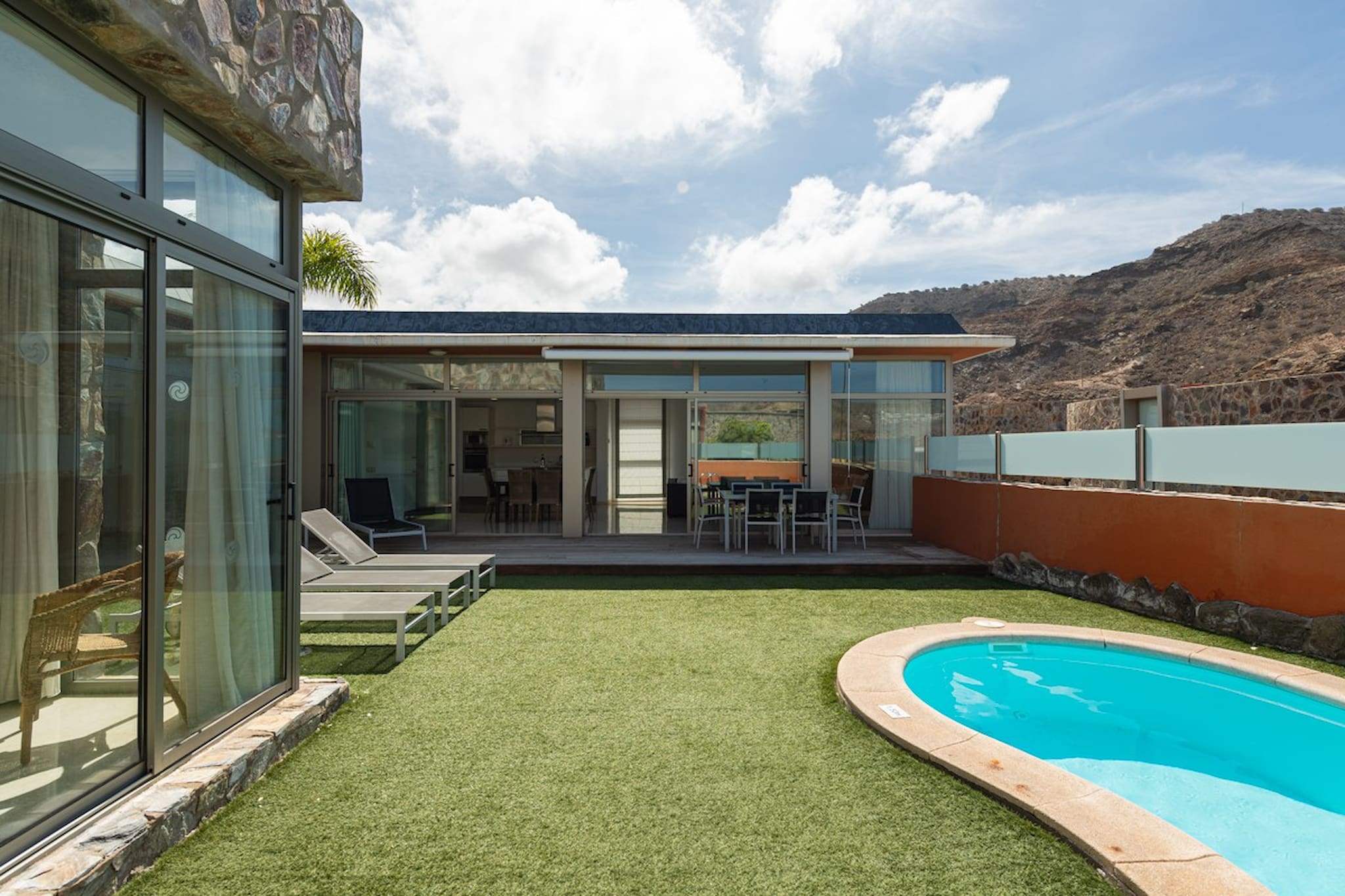 Die Villa in Mogán verfügt über 3 Schlafzimmer und hat eine Kapazität für 6 Person(en). Unterkunft verfügt über 250 m². Die Unterkunft verfügt über einen Garten, Gartenmöbel, ein umzäuntes Grundstück, eine Terrasse, eine Waschmaschine, einen Trockner, einen Grillplatz, ein Bügeleisen/-brett, ein Internetanschluss (WLAN), ein Föhn, ein Whirlpool, eine elektrische Heizung, eine Klimaanlage, ein Privatpool, einen klimatisierter Privatpool, eine Garage auf dem Grundstück, ein Fernsehgerät, Satelliten-TV.Die Offene Küche mit elektrisches Kochfeld ist ausgestattet in einen Kühlschrank, eine Mikrowelle, ein Backofen, Gefrierschrank, eine Spülmaschine, Geschirr/Besteck, Kochutensilien, eine Kaffeemaschine, einen Toaster, einen Wasserkocher, eine Saftpresse und Herdplatte.