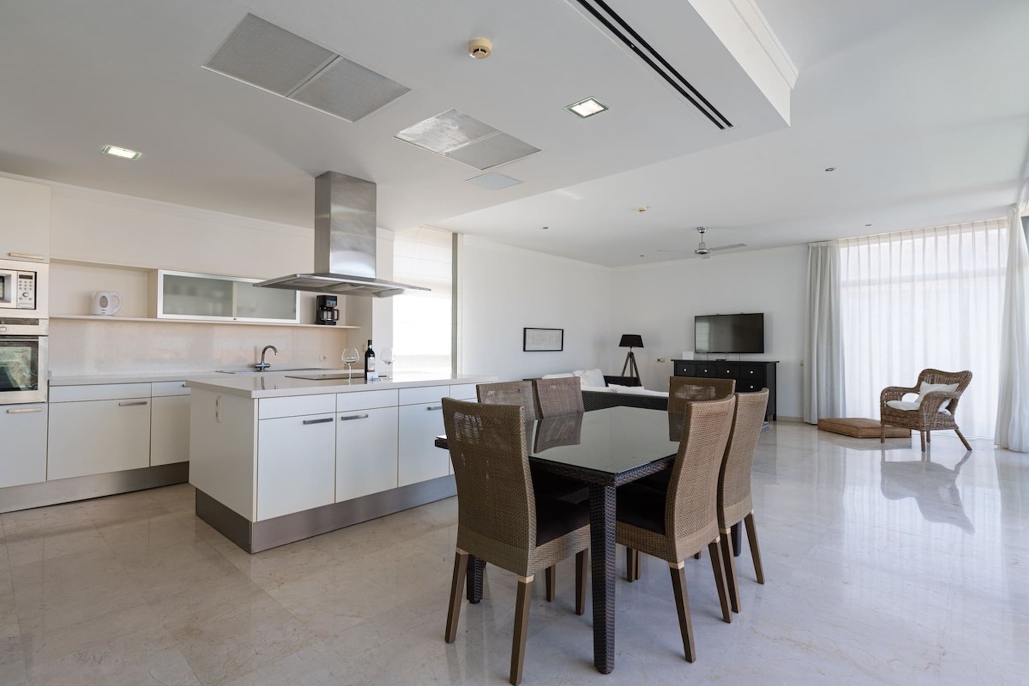 Die Offene Küche mit elektrisches Kochfeld ist ausgestattet in einen Kühlschrank, eine Mikrowelle, ein Backofen, Gefrierschrank, eine Spülmaschine, Geschirr/Besteck, Kochutensilien, eine Kaffeemaschine, einen Toaster, einen Wasserkocher, eine Saftpresse und Herdplatte.