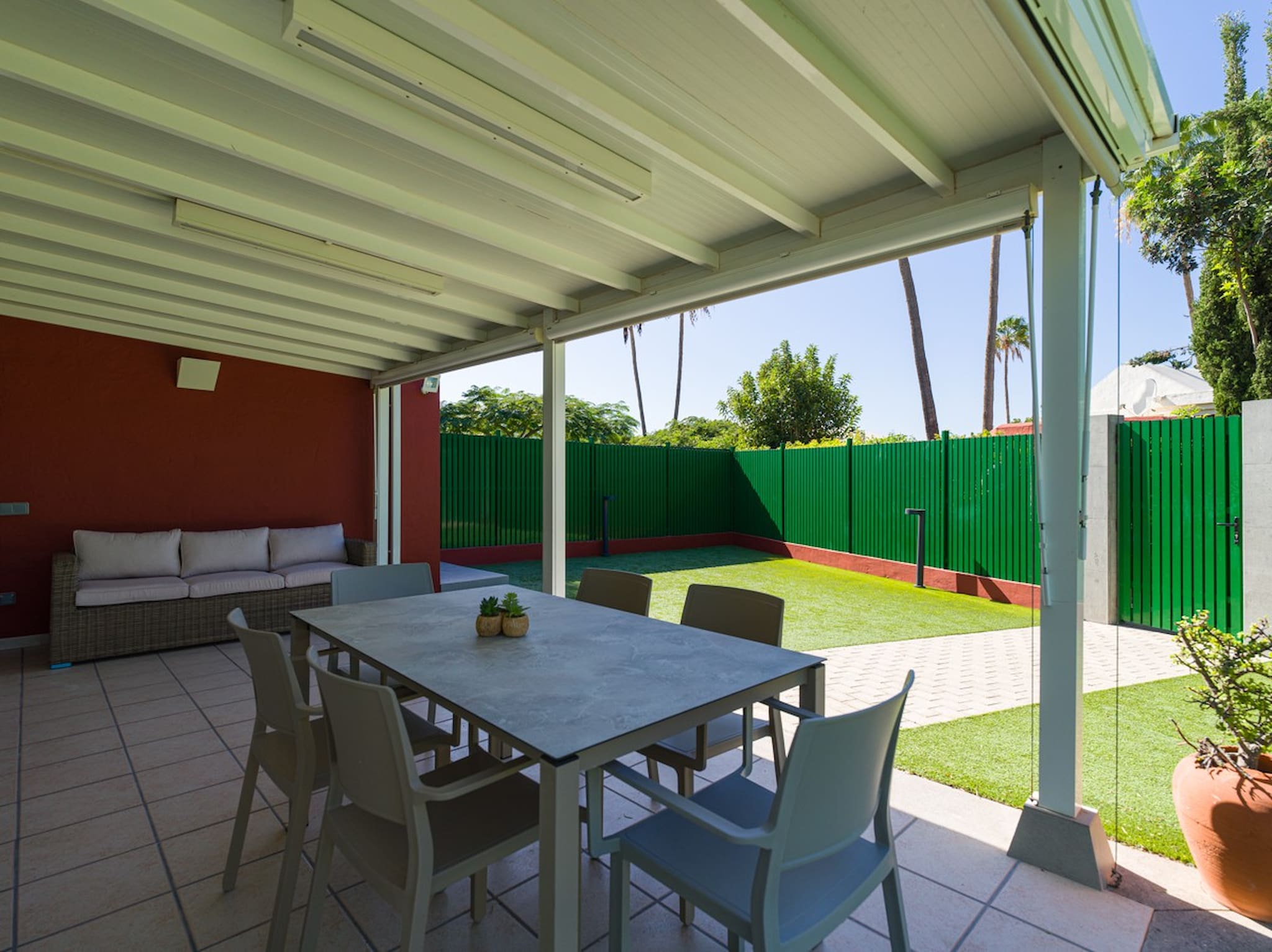 Bungalow deluxe recién reformado y totalmente equipado con jardín privado, porche con comedor exterior y una gran piscina comunitaria, situado en una zona tranquila de Maspalomas, cerca del campo de golf, las dunas y la playa de Maspalomas, para unas vacaciones perfectas en el sur de Gran Canaria.