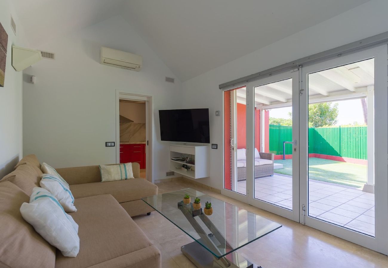 El bungalow consta de una sala de estar con sofá y TV y una zona de comedor, abierta a una terraza cubierta con comedor exterior, y un amplio jardín con zona de estar, barbacoa y tumbonas, una cocina totalmente equipada, un dormitorio principal con una cama king-size, un segundo dormitorio con dos camas individuales, un tercer dormitorio con una cama doble, y un baño completo con ducha. Está rodeado de bonitos jardines comunitarios y tiene una gran piscina compartida.