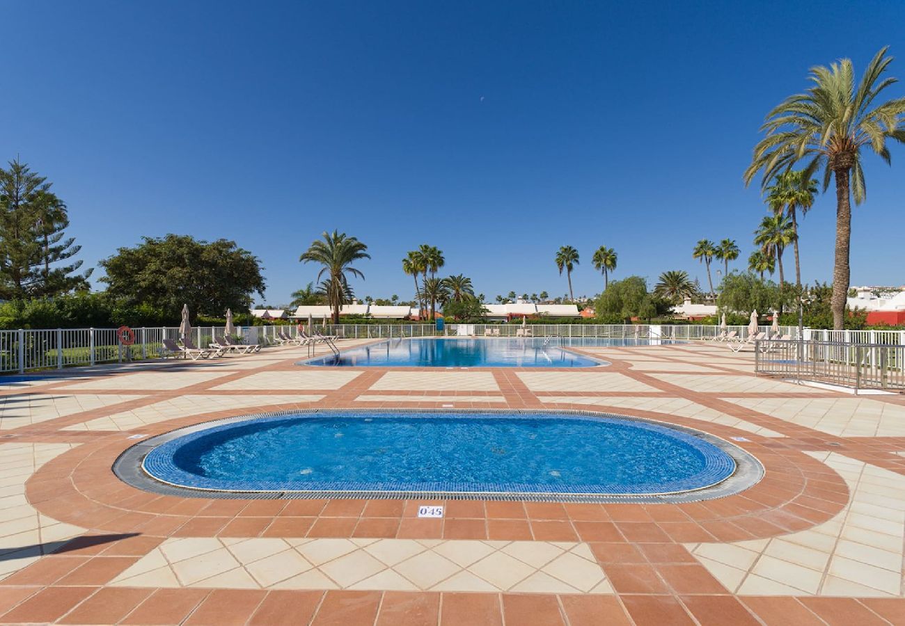 Bungalow totalmente equipado y renovado con terraza porche con comedor, jardín y una gran piscina comunitaria, ubicado en una zona tranquila de Maspalomas, cerca del campo de golf, las dunas y la playa de Maspalomas, para unas vacaciones perfectas en el sur de Gran Canaria.