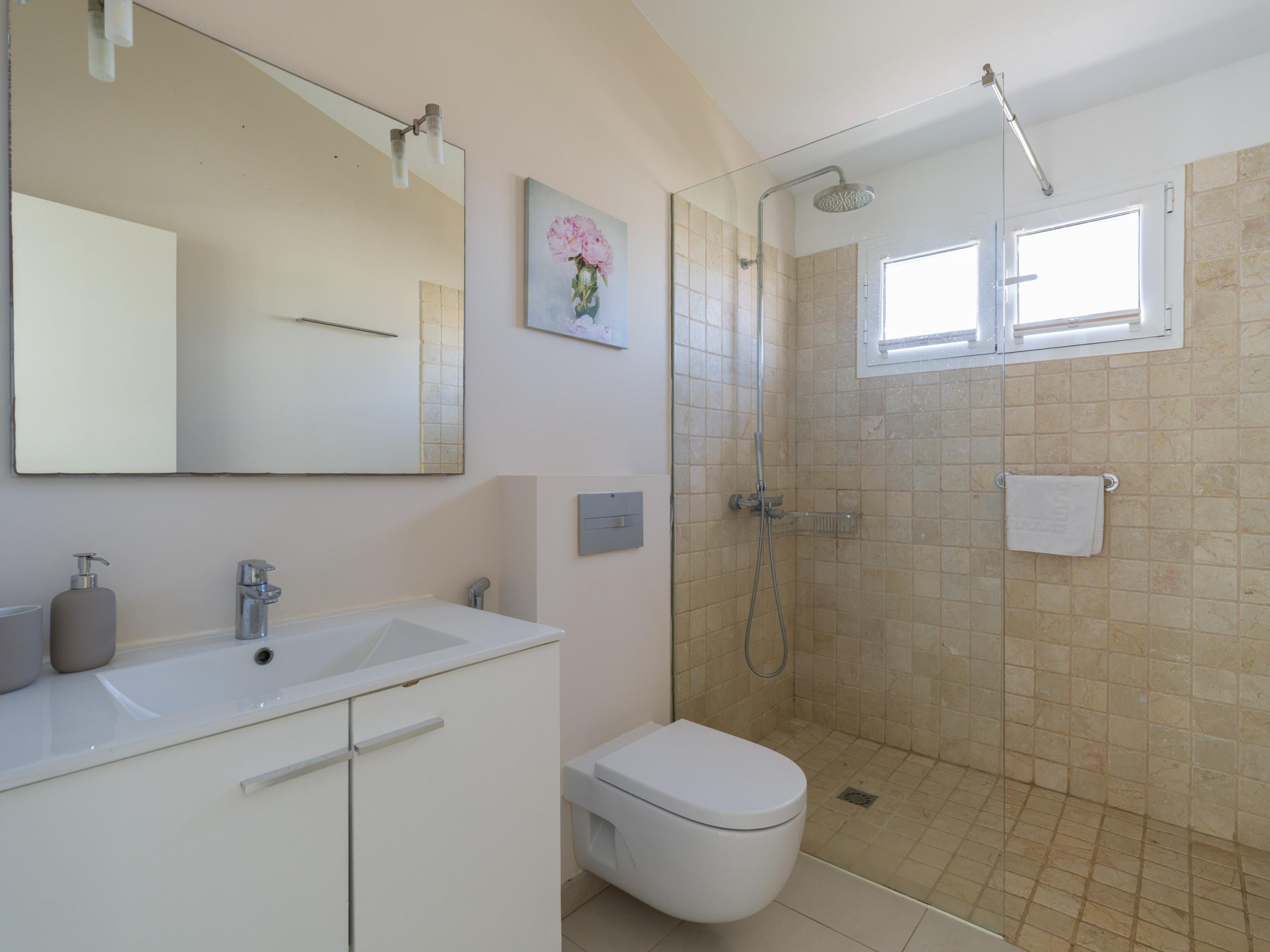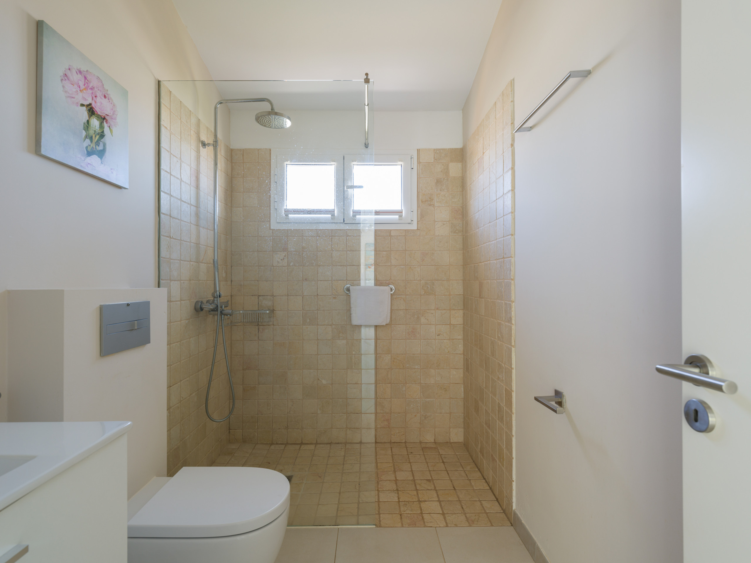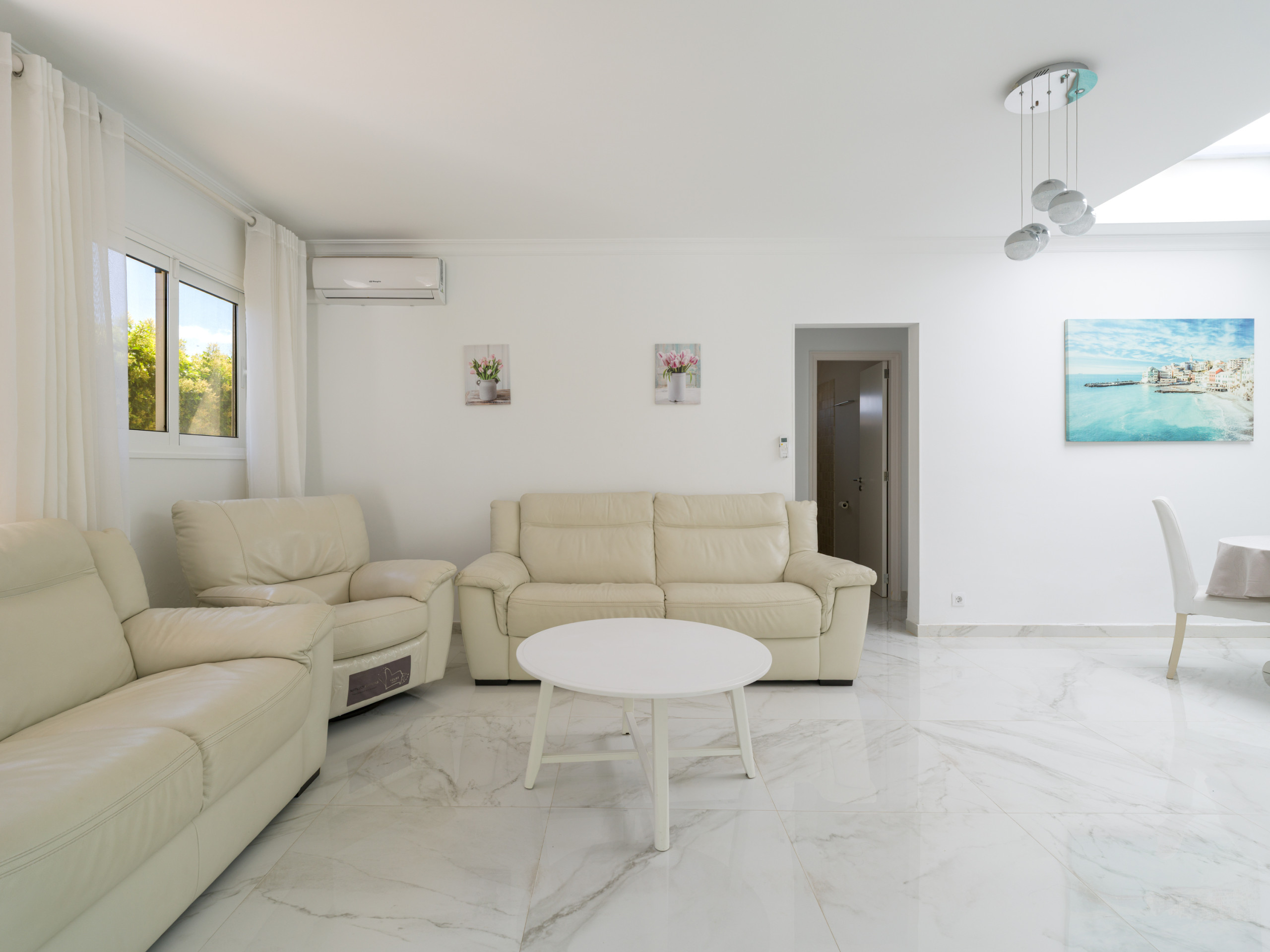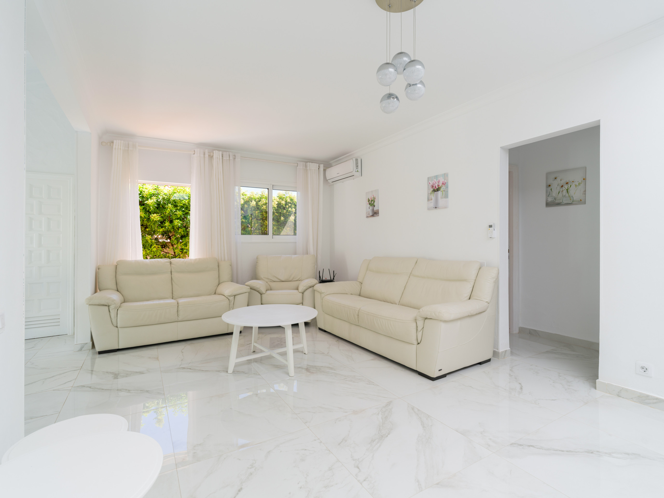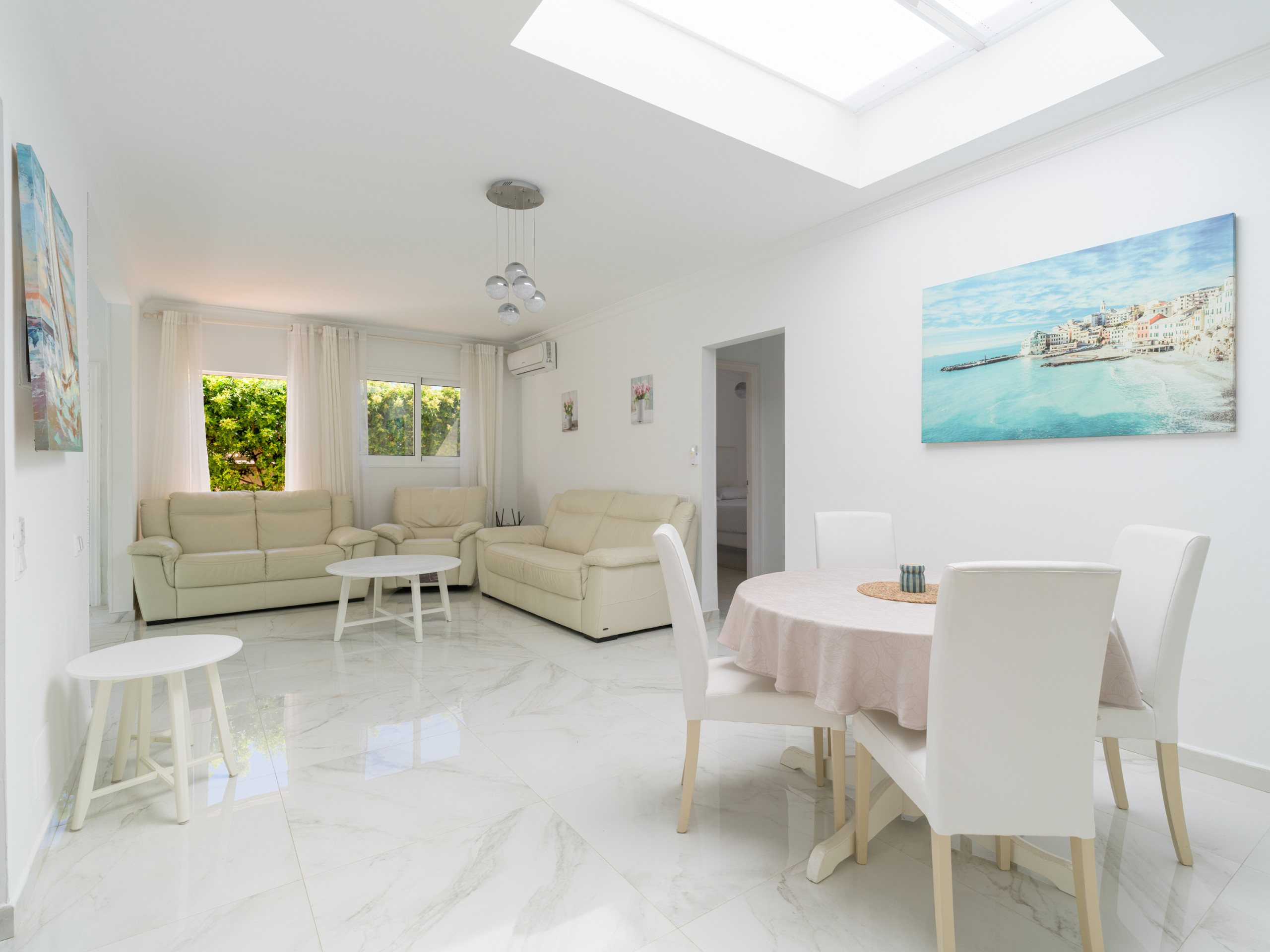 La casa se distribuye en una sola planta a pie de calle y consta de un amplio salón con smart tv, zona de comedor y cocina abierta totalmente equipada, un espacio exterior privado con zona de estar y comedor al aire libre, un solárium privado con vistas al mar en la azotea, tres dormitorios, uno con cama king size, otro con dos camas individuales y el otro con una cama individual, y tres baños completos con plato de ducha. Los huéspedes también tienen acceso a una gran piscina común y jardín con tumbonas.