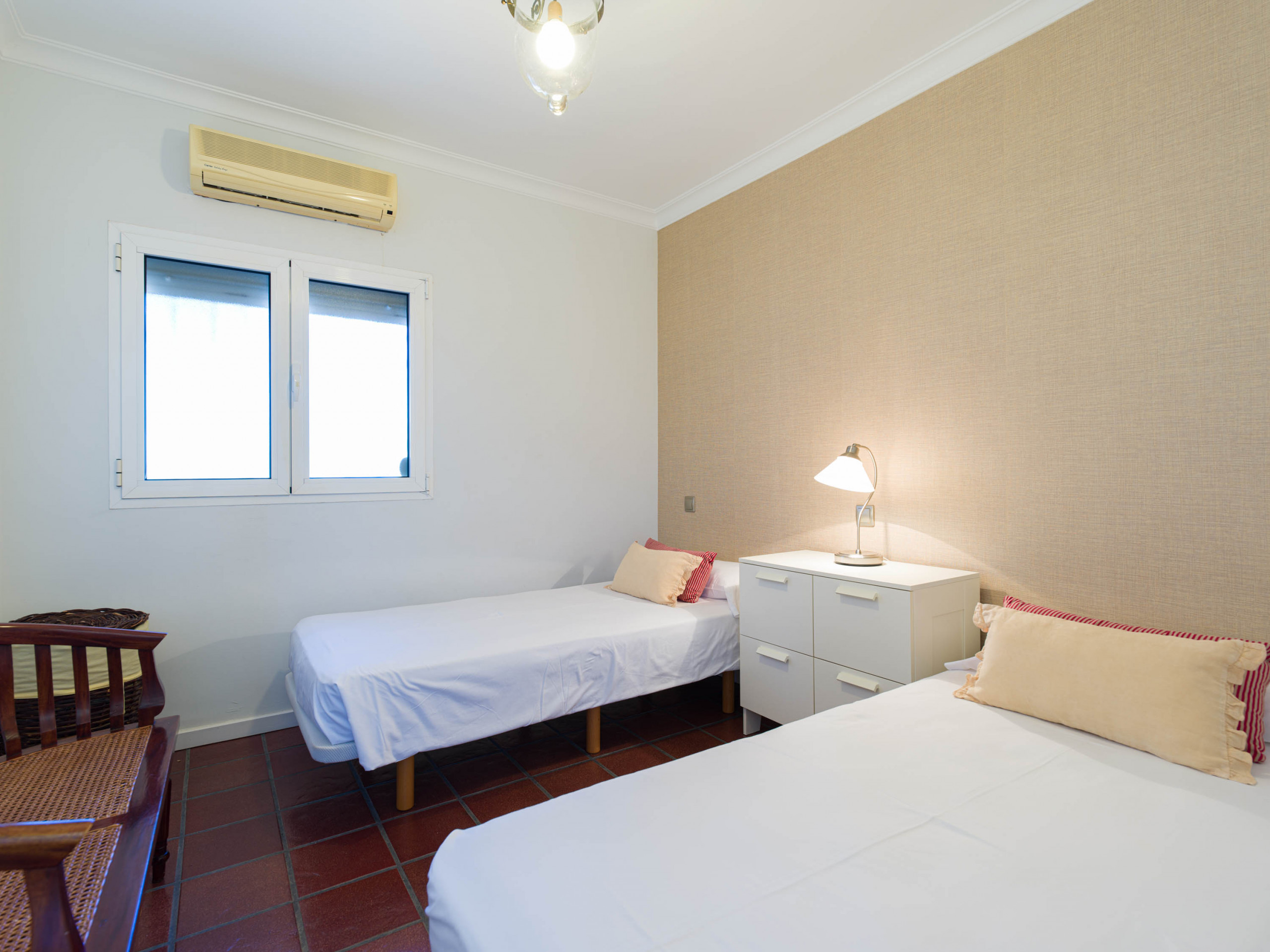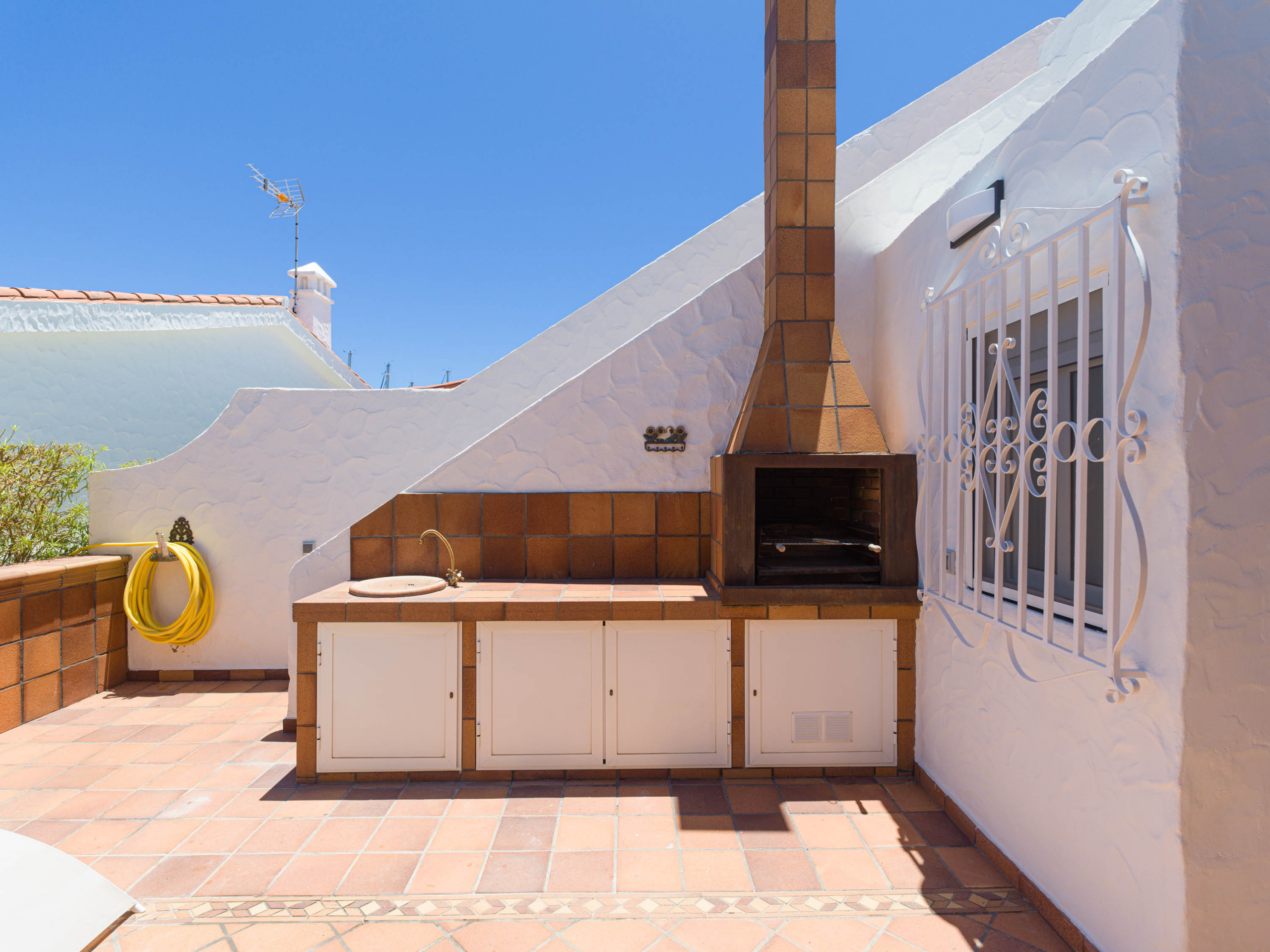 La casa se distribuye en una sola planta a pie de calle, y consta de un amplio salón con smart tv, zona de comedor y cocina abierta totalmente equipada, un espacio exterior privado con zona de comedor exterior y barbacoa, un solárium privado con vistas al mar en la azotea, dos dormitorios dobles, uno con cama king size y otro con dos camas individuales, y dos baños completos con plato de ducha. Los huéspedes también tienen acceso a una gran piscina y jardín comunes.