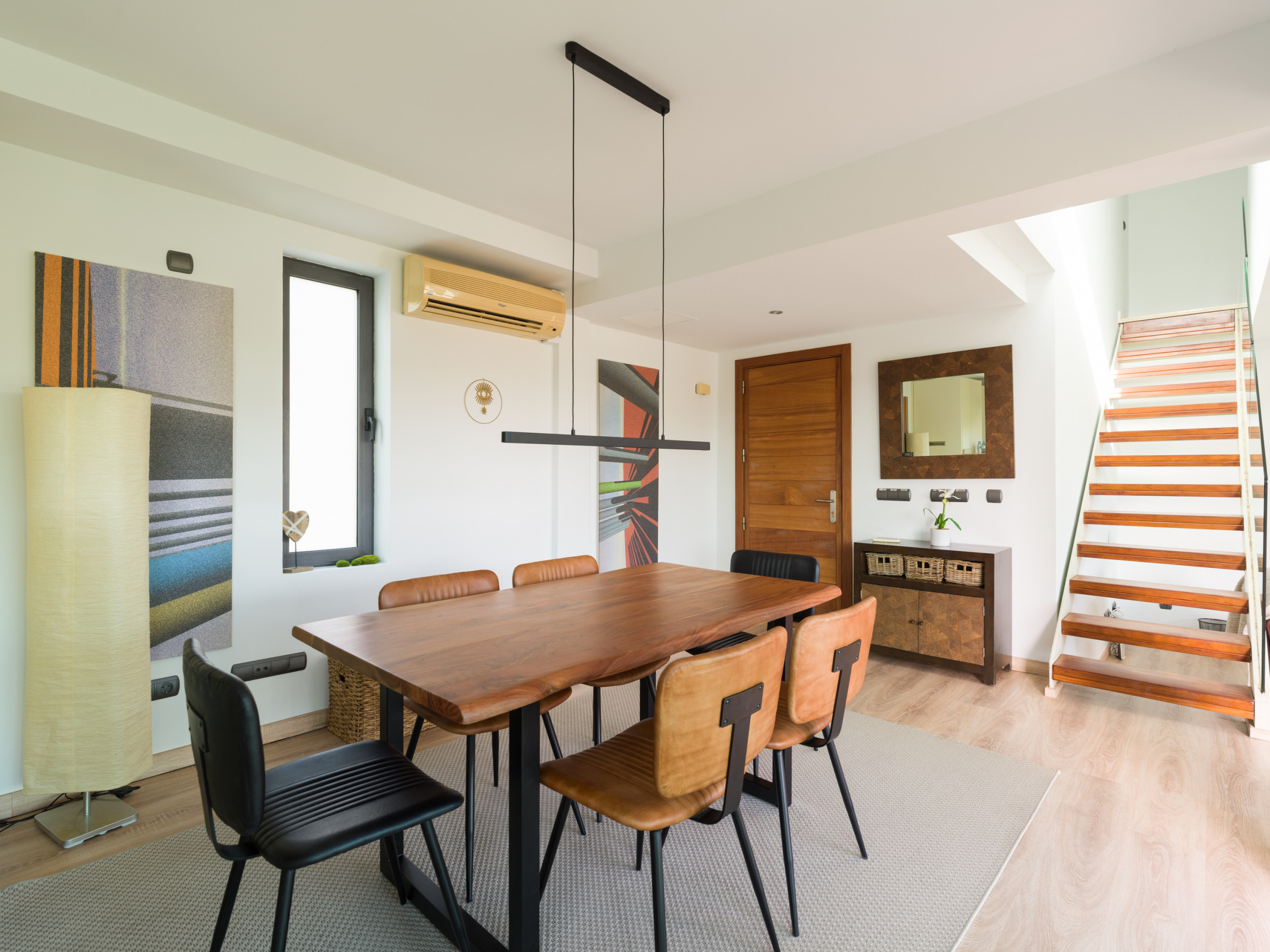 La planta baja consta de un área abierta con una cocina totalmente equipada, comedor y sala de estar, conectados a través de grandes puertas corredizas de vidrio a una terraza cubierta, y un área de dormitorio separada con dos camas individuales y baño privado completo. La primera planta consta de un dormitorio con cama king size, baño completo y terraza solárium. La villa tiene un bonito jardín y una piscina privada climatizada.