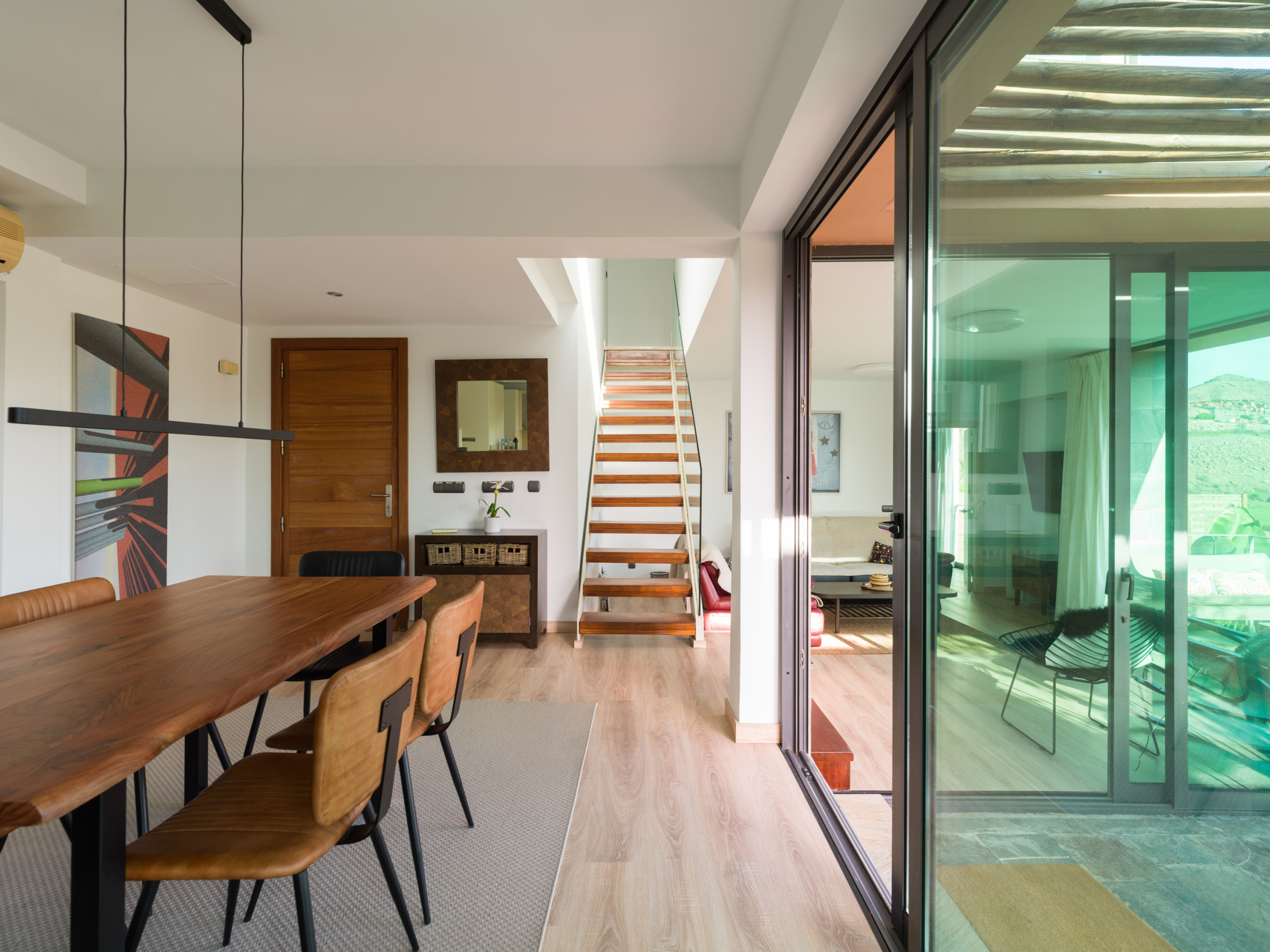 La planta baja consta de una zona abierta con una cocina totalmente equipada, comedor y sala de estar, conectada a través de grandes puertas correderas de cristal a una terraza cubierta, y una zona de dormitorio independiente con dos camas individuales y un baño privado con ducha. La primera planta consta del dormitorio principal con una cama king size, un baño completo privado y acceso directo a una terraza solarium. La villa tiene un bonito jardín y una piscina privada climatizada.