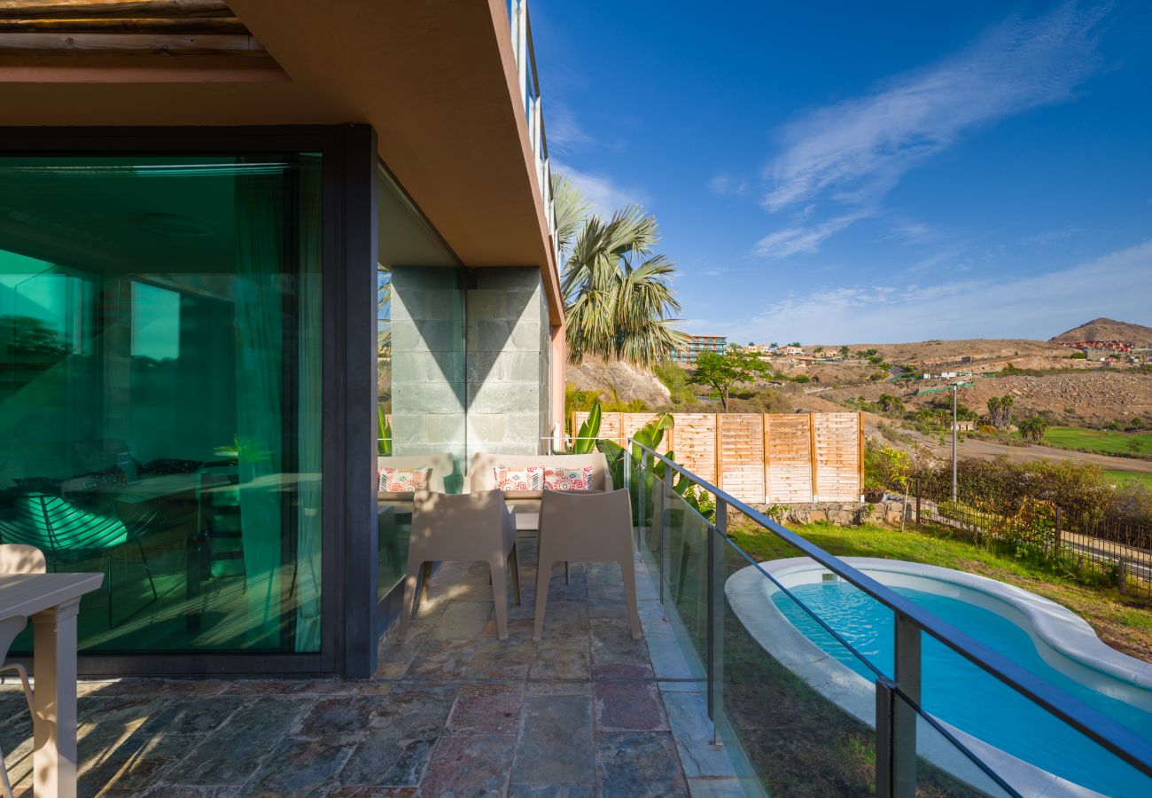 Villa moderna, totalmente equipada, con jardín, terraza y piscina privada, situada a pie de campo de golf en la urbanización privada Salobre Golf y rodeada de naturaleza, con maravillosas vistas a las montañas, al campo de golf y al mar, y con todos los servicios disponibles para unas vacaciones perfectas en el sur de Gran Canaria.