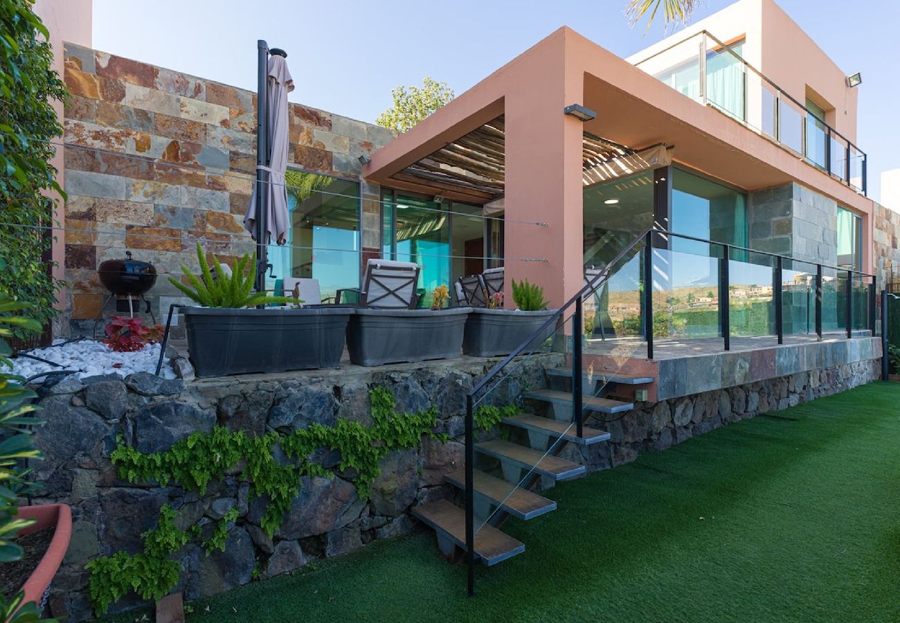 Villa de lujo de nueva construccion, totalmente equipada, con jardín, terraza y piscina privada, situada a pie de campo de golf en la urbanización privada Salobre Golf y rodeada de naturaleza, con maravillosas vistas a las montañas, al campo de golf y al mar, y con todos los servicios disponibles para unas vacaciones perfectas en el sur de Gran Canaria.