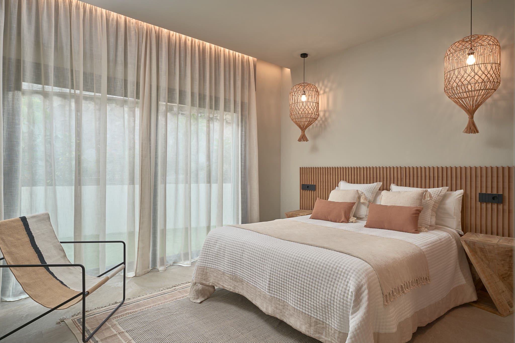 La villa se distribuye en una sola planta, pero situada en altura sobre el nivel de la calle para una mejor vista y menos ruido, con acceso tanto por escaleras como por ascensor. Consta de un amplio salón, con zona de tv/sofá, zona de comedor y cocina abierta totalmente equipada, y con grandes puertas correderas de cristal que dan al jardín/terraza y zona de piscina. El dormitorio principal tiene una cama king size y un baño completo con ducha. El segundo dormitorio tiene dos camas individuales y hay un segundo baño completo con ducha. Ambos dormitorios tienen acceso directo al jardín a través de puertas correderas de cristal. La villa está rodeada por un amplio espacio al aire libre con comedor y áreas de descanso, y tiene una piscina privada climatizada con vistas.