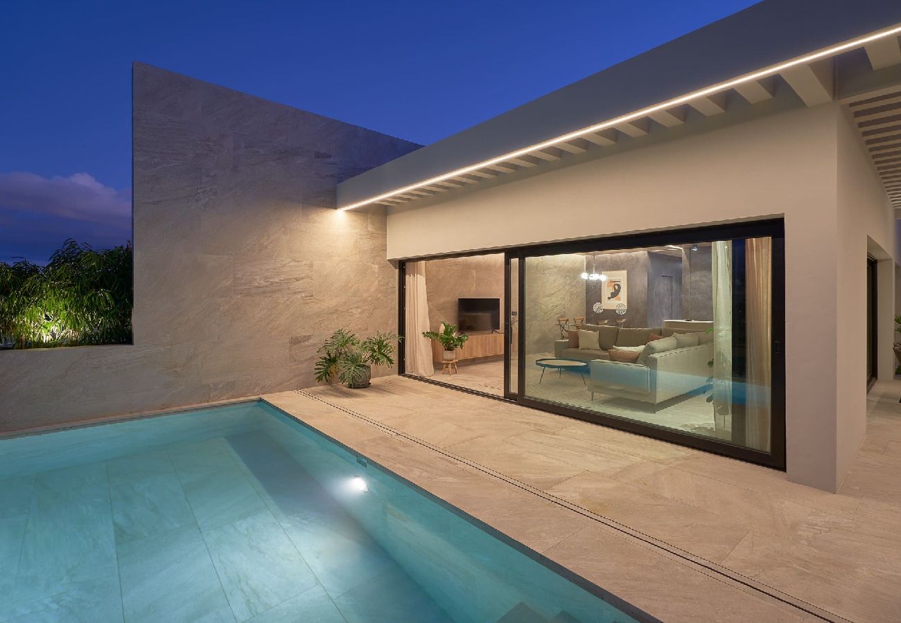 Villa de lujo de obra nueva de 2 dormitorios con piscina privada climatizada, terraza y jardín, situada a pie de campo de golf en el complejo privado Salobre Golf y rodeada de naturaleza, con maravillosas vistas al campo de golf y a la montaña, y con todas servicios disponibles para unas vacaciones perfectas en el sur de Gran Canaria.