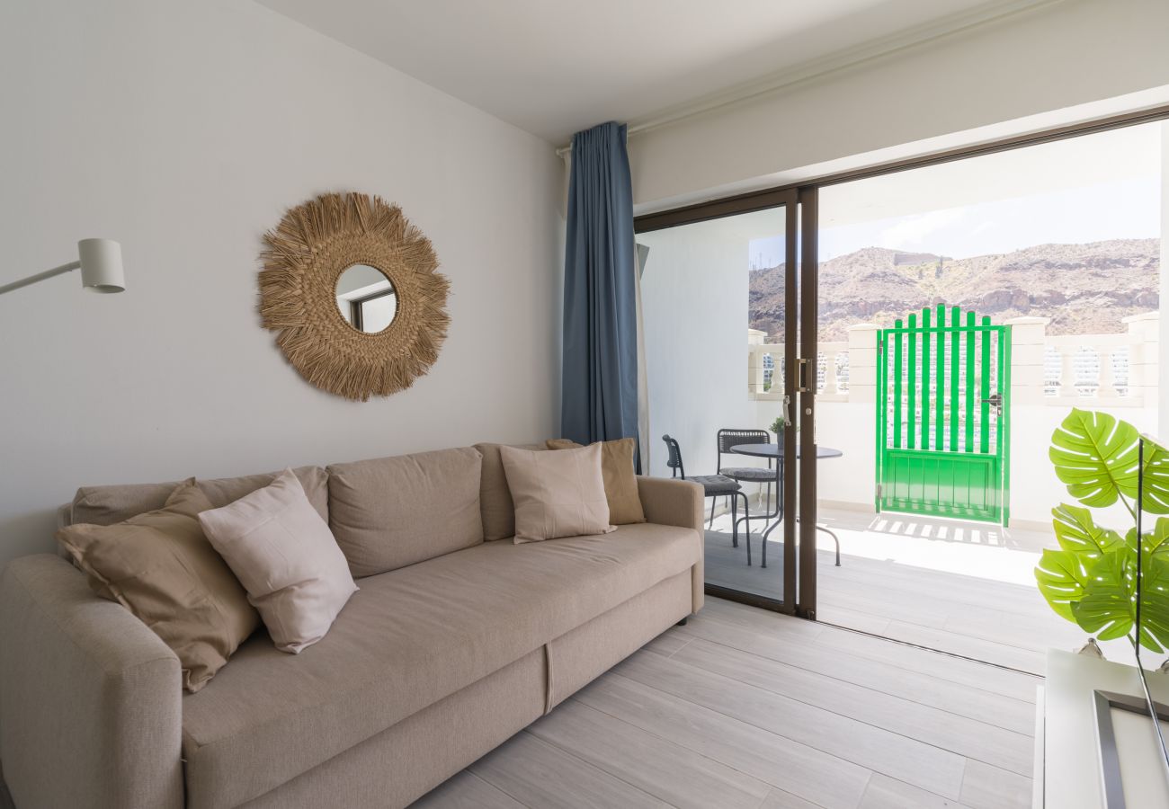 Fully-equipped renovated apartment with terrace and shared swimming pool, with an excellent location in Puerto Rico at walking distance from the beach, and with all services available for a perfect holiday in the south of Gran Canaria.