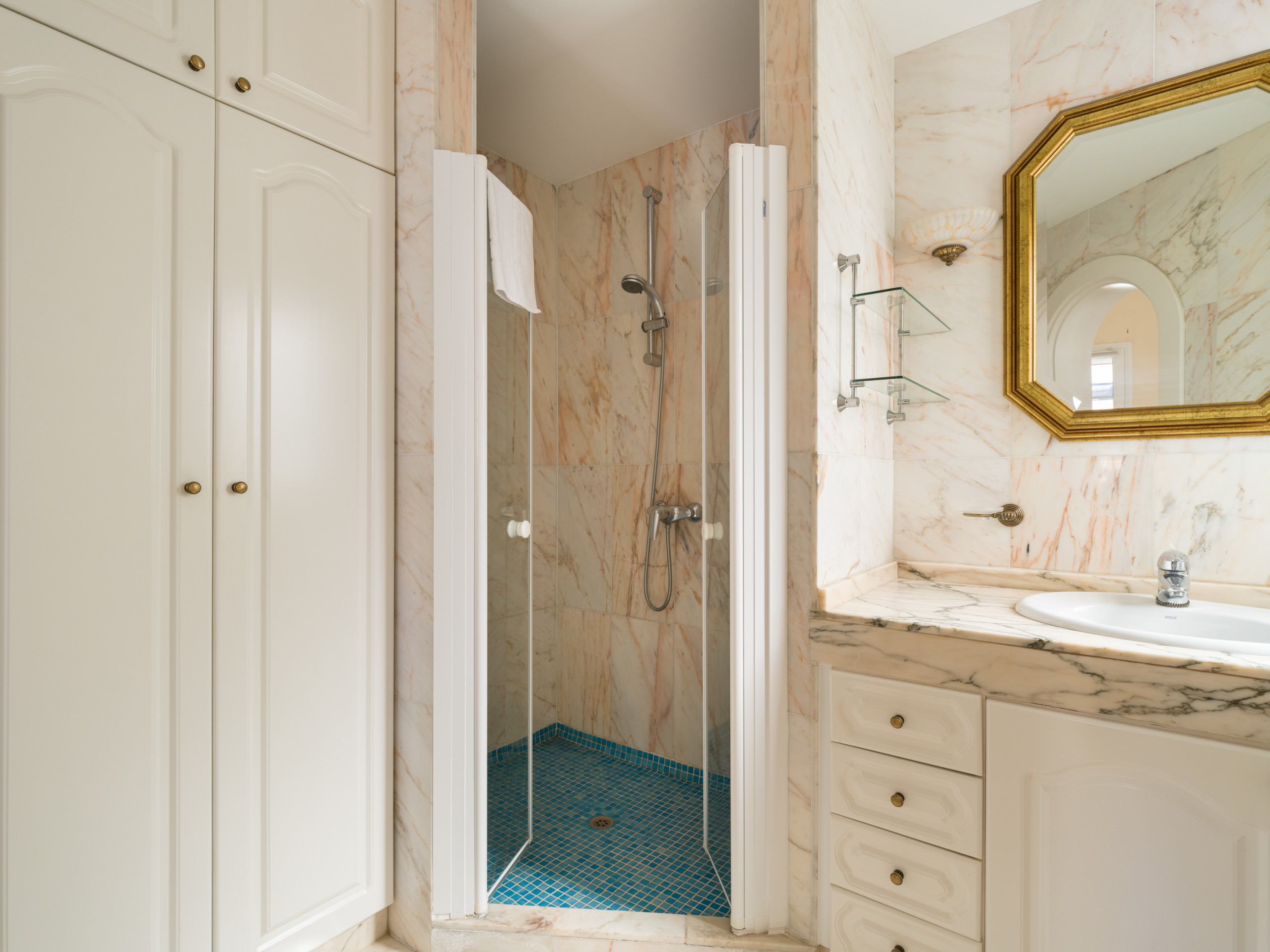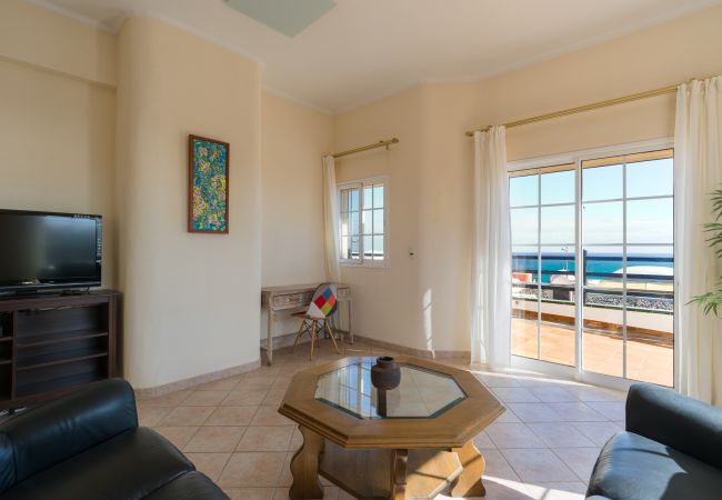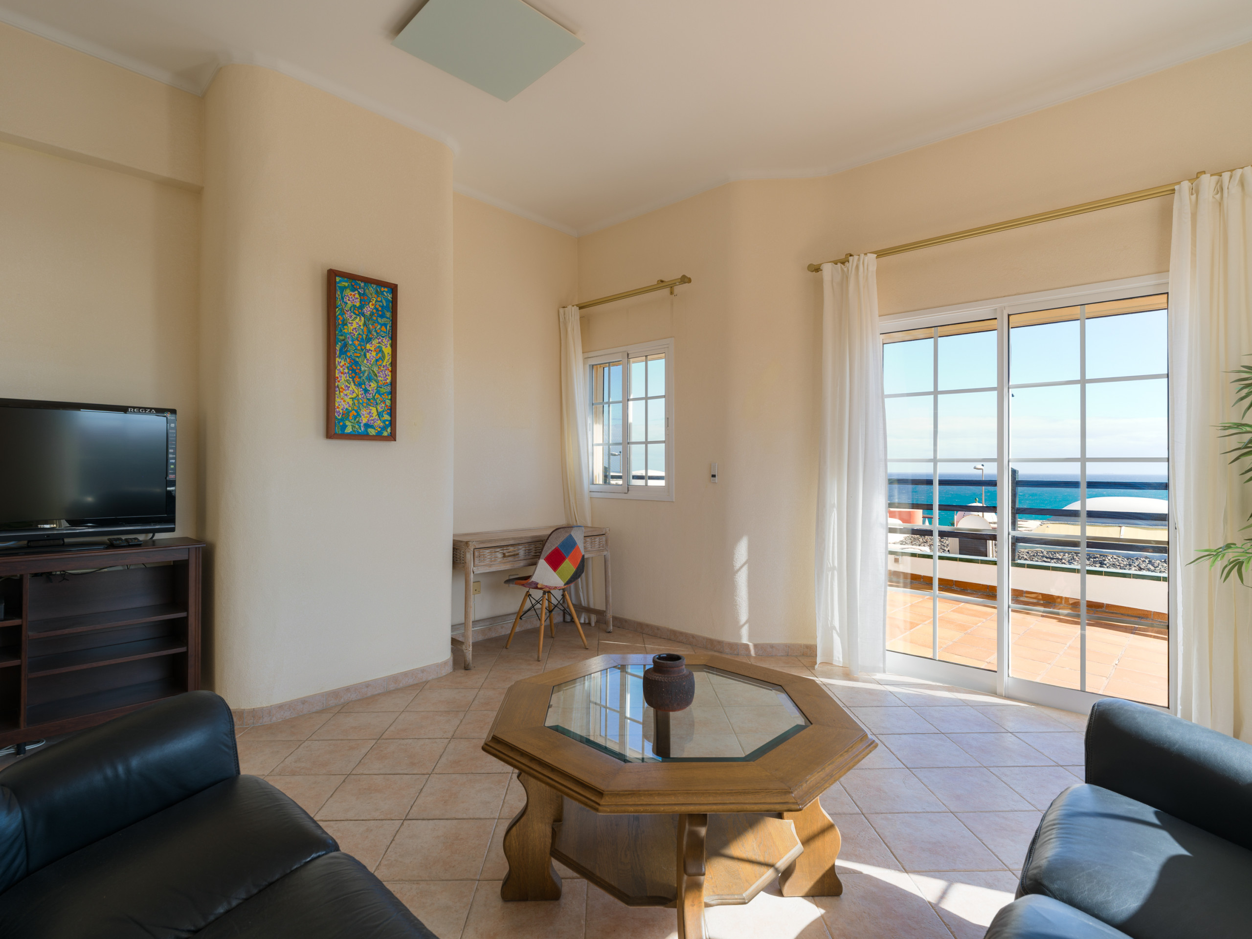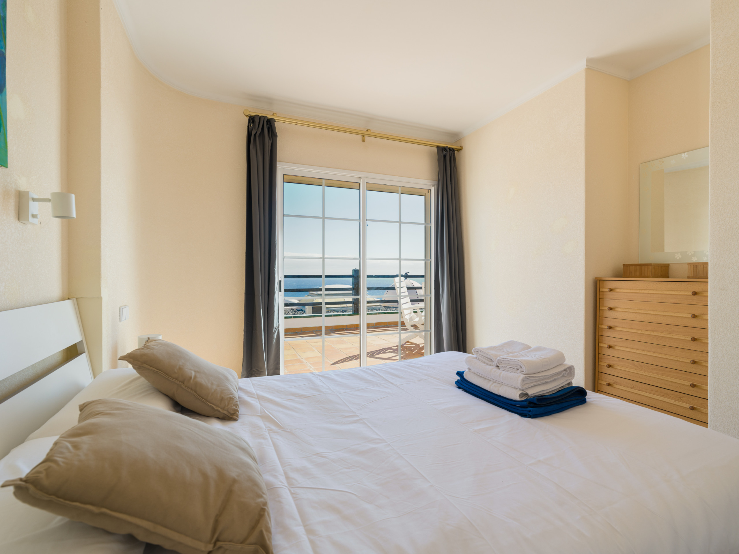 The ground floor consists of a living room with sea views and access to the terrace, a fully equipped kitchen with dining area, a master bedroom with sea views and access to the terrace, a full bathroom with shower, and a second double bedroom with private bathroom with shower.