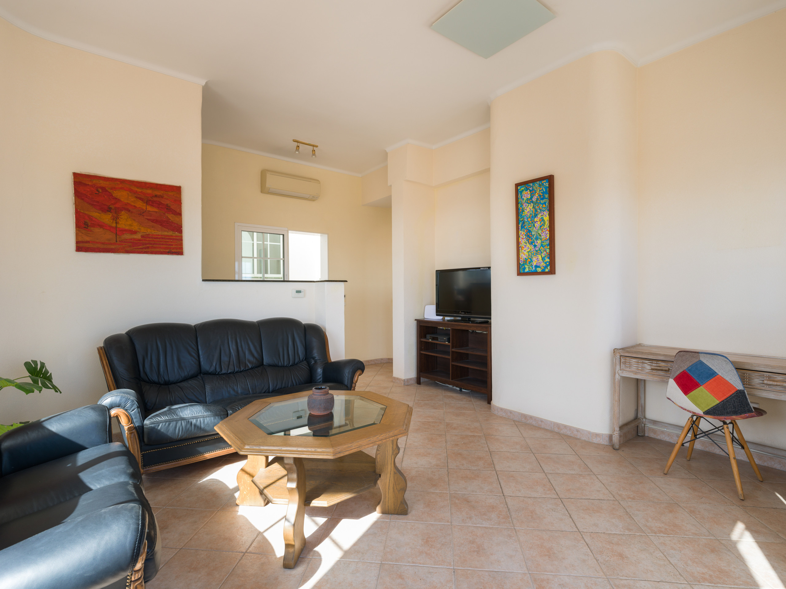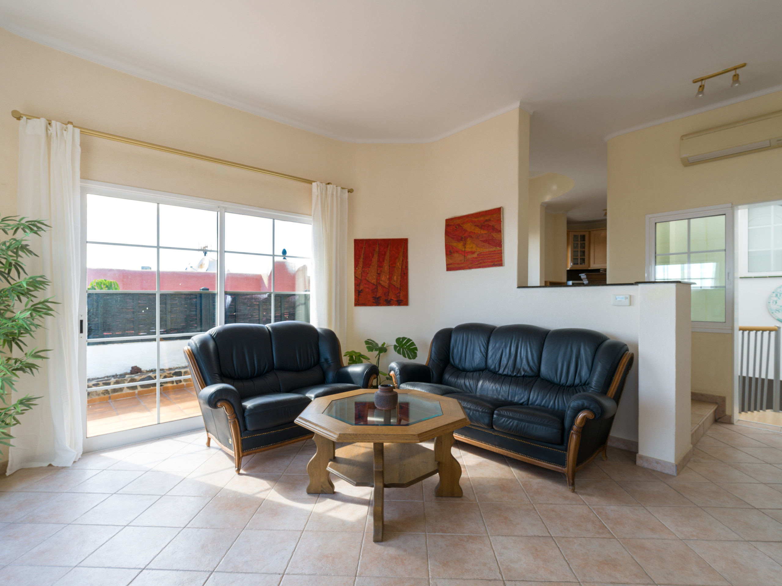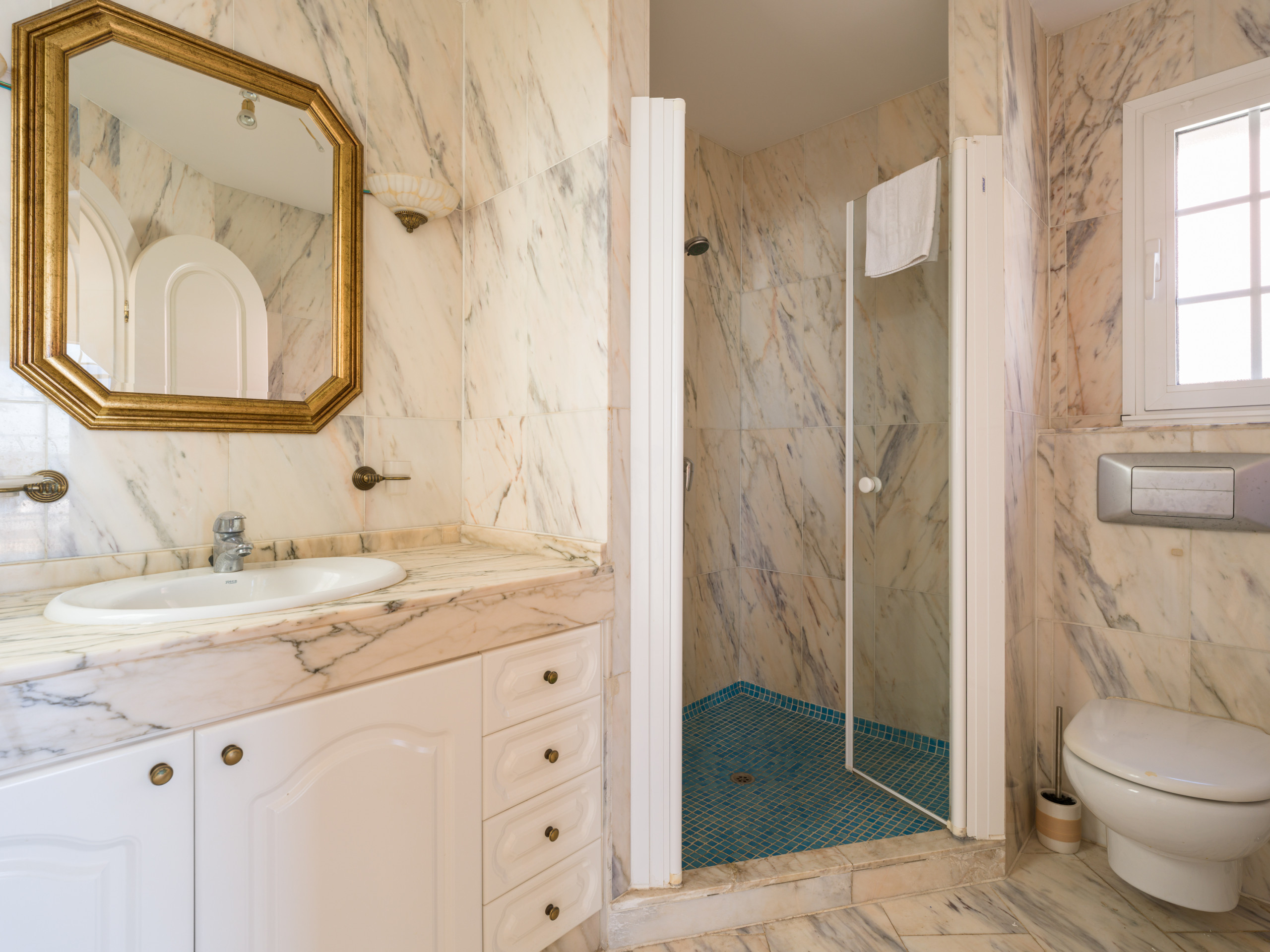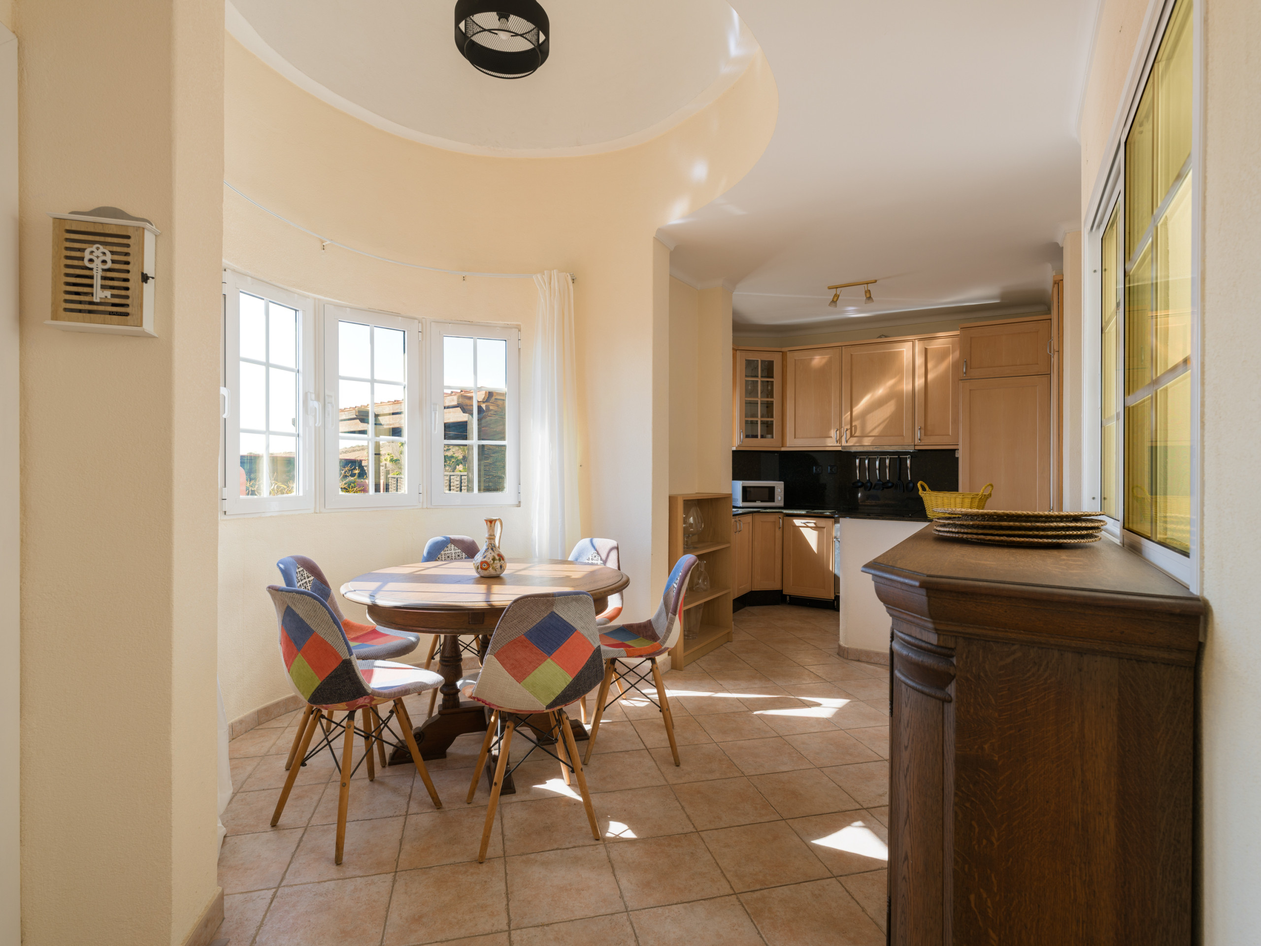 The ground floor consists of a fully equipped independent kitchen, which is open to a covered terrace with an outdoor dining area, a living/dining room, connected through big glass sliding doors to the garden and swimming pool area, and a toilet. The first floor consists of 3 bedrooms, 2 bathrooms and a solarium terrace. The main bedroom has a king size bed, a complete private bathroom and a large gazer window with views to the golf course. The second and third bedrooms have 2 twin beds each, sharing a complete bathroom, and one of them has direct access to the solarium terrace. The villa is surrounded by a nice garden and a private, heated swimming pool.
