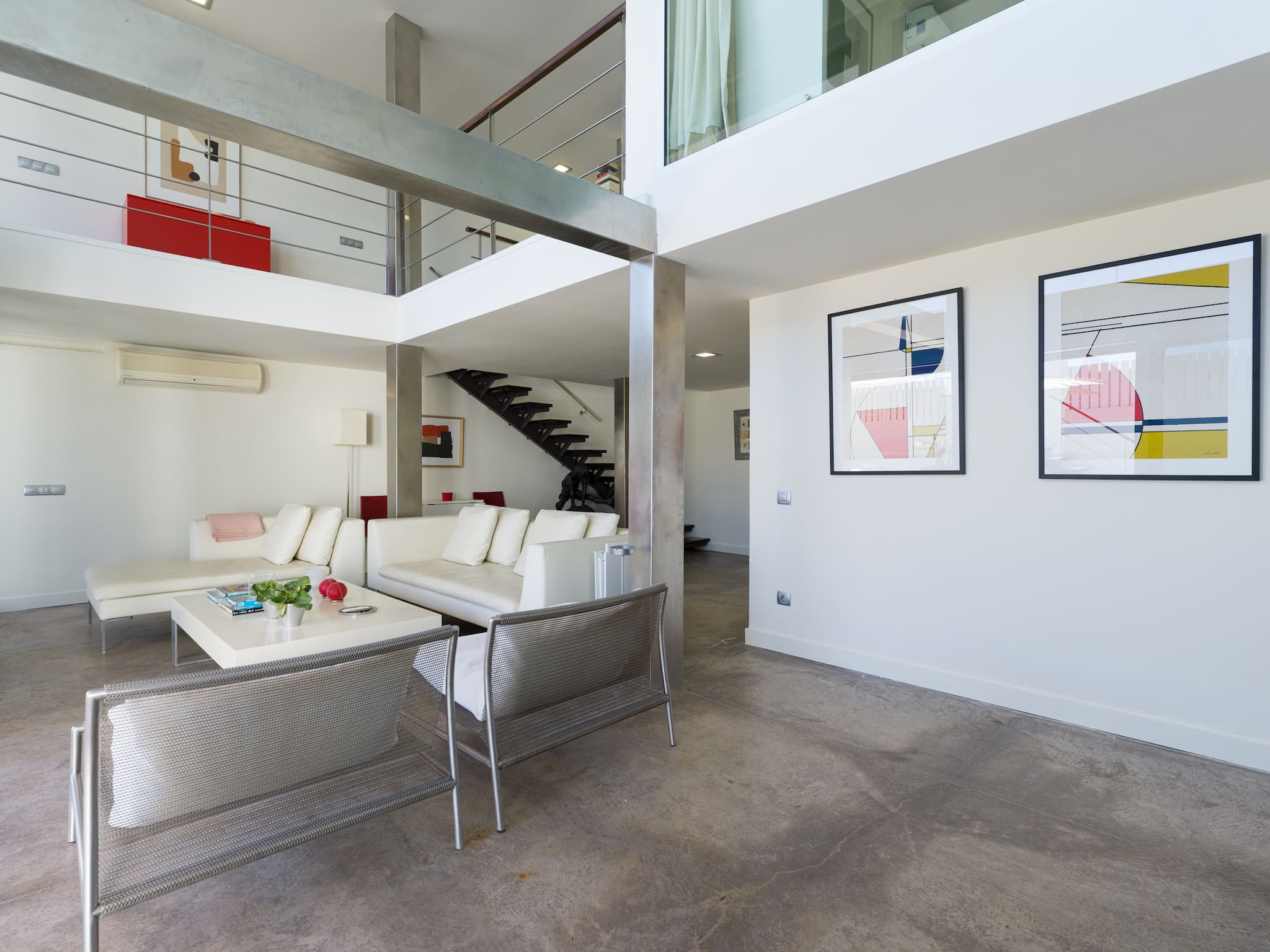 The ground floor consists of a fully equipped kitchen, a living room with large glass windows, a toilet and a wide private terrace with outdoor shower and outdoor seating, sun bathing and dining areas. The first floor is built as a loft and consists of a double bedroom with king size bed and wonderful views, a dressing room and a full bathroom ensuite with shower, a spacious workspace with views, and a long outdoor terrace with seating area and wonderful seaviews.