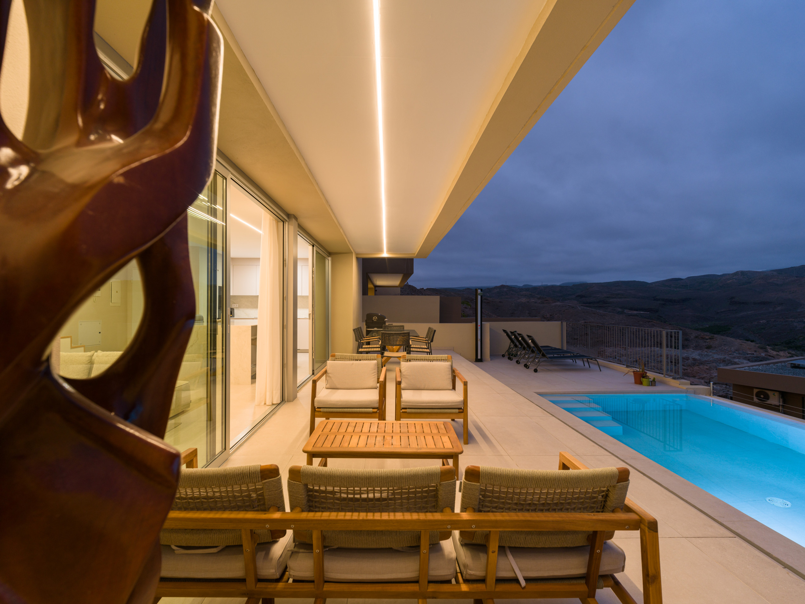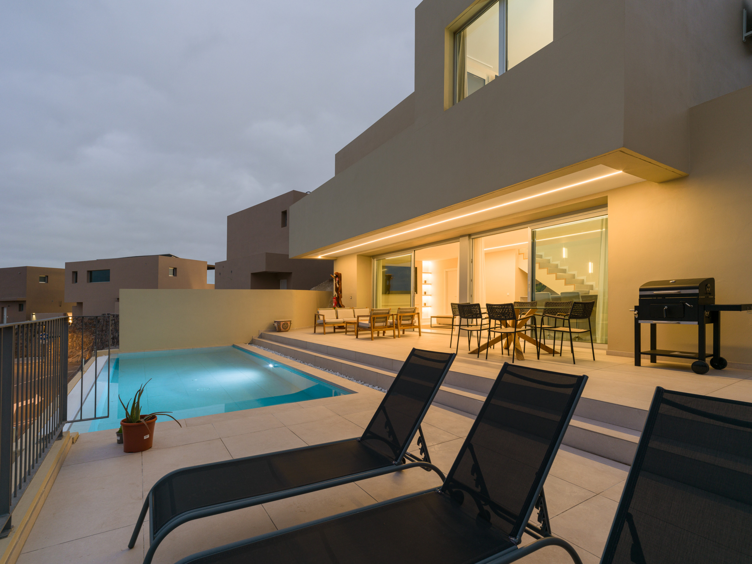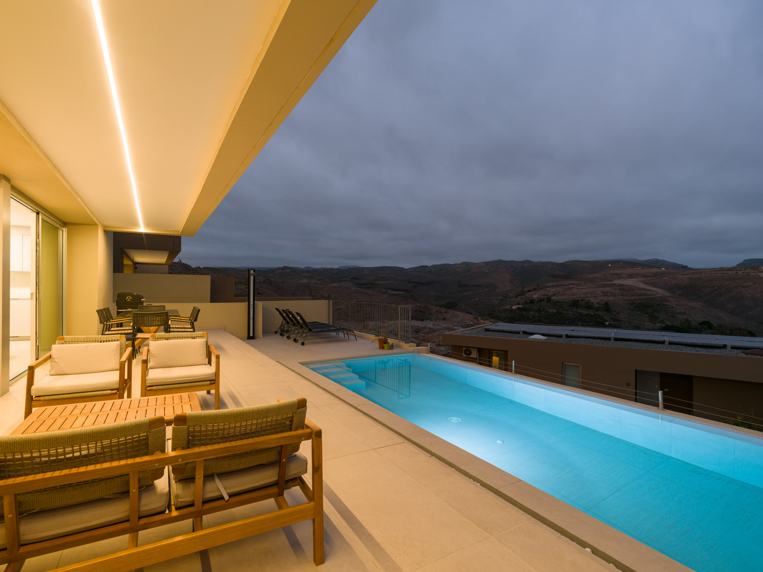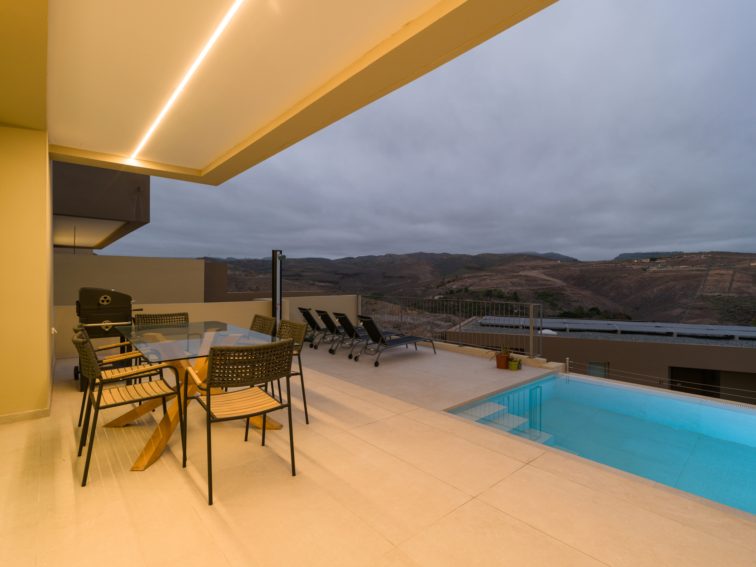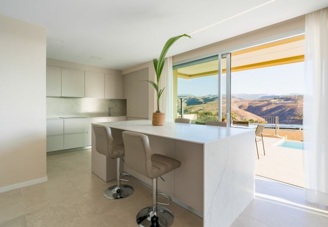 New construction, fully equipped villa with a terrace and private heated pool, located in the private Salobre Golf urbanization and surrounded by nature, with wonderful mountain views and all the amenities for a perfect holiday in the south of Gran Canaria.