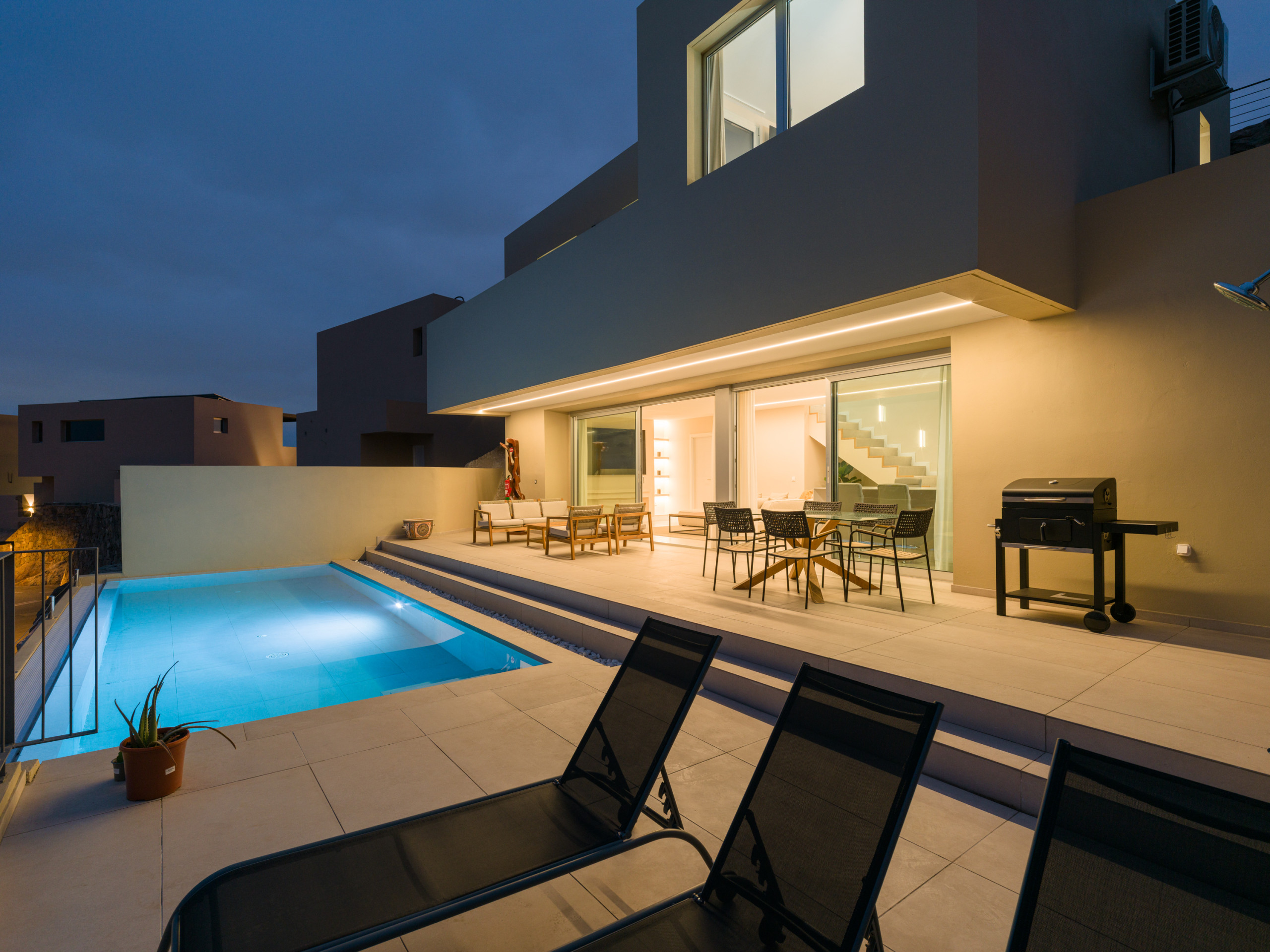 The ground floor comprises a fully equipped open kitchen, an open dining and living room area, connected through large sliding glass doors to the terrace and pool area, and a guest toilet. The first floor has three bedrooms, two bathrooms, and a balcony overlooking the pool and mountains. The master bedroom features a king-size bed and an en-suite bathroom with a shower. The second and third bedroomshave double bed and two tein beds, and share a full bathroom with a shower. The villa has a spacious terrace and a private swimming pool with views.