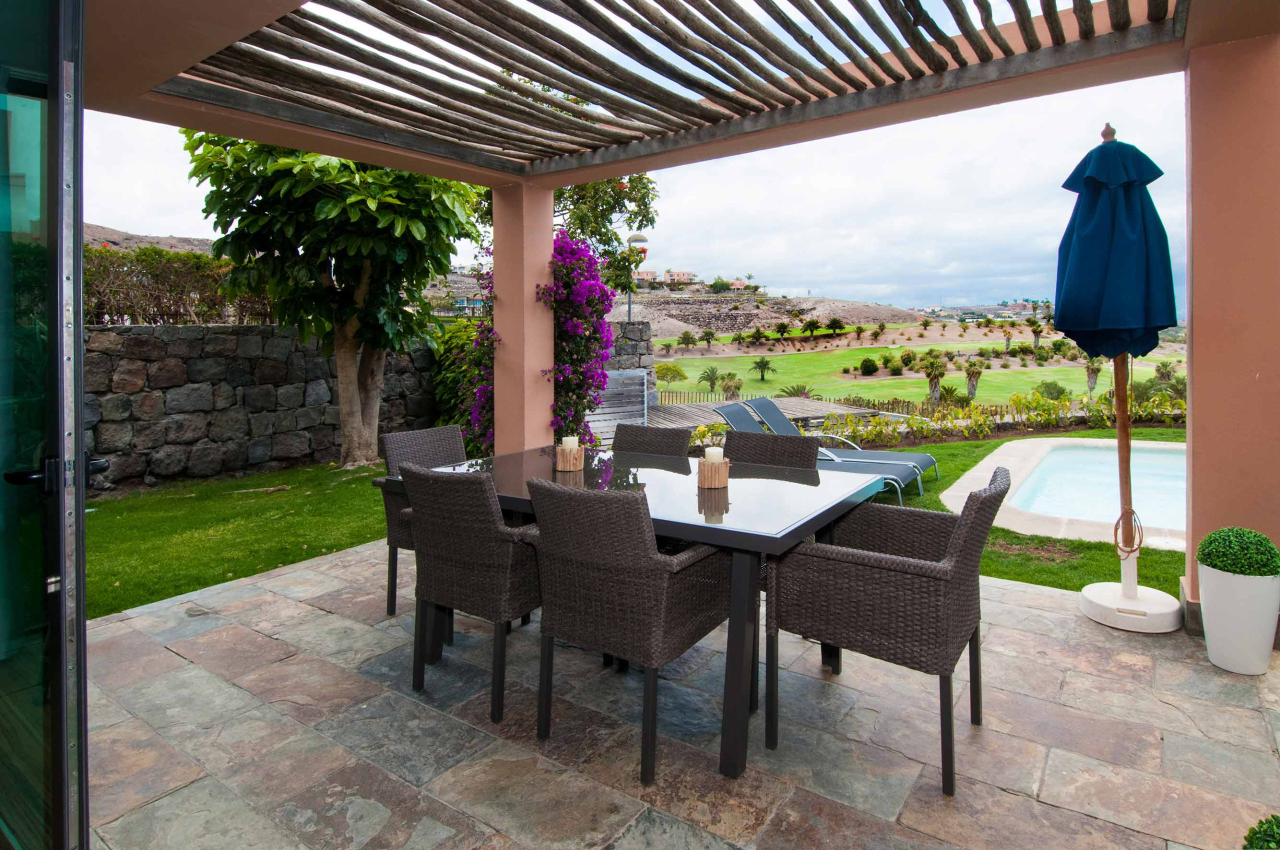 Fully equipped 3-bedroom villa with garden, terrace, and private heated pool, located at the foot of the golf course in the private Salobre Golf resort and surrounded by nature, with wonderful views of the mountains and the golf course, and with all the amenities available for a perfect holiday in the south of Gran Canaria.